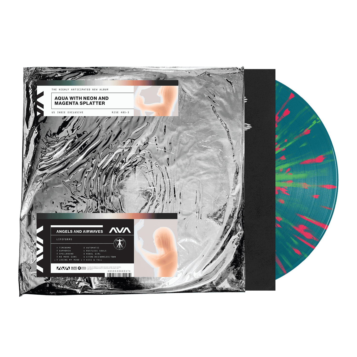 The Angels and Airwaves Lifeforms LP includes a 12-page booklet and an Aqua with Neon and Magenta Splatter colored vinyl inside a standard jacket encased in a mylar space bag.