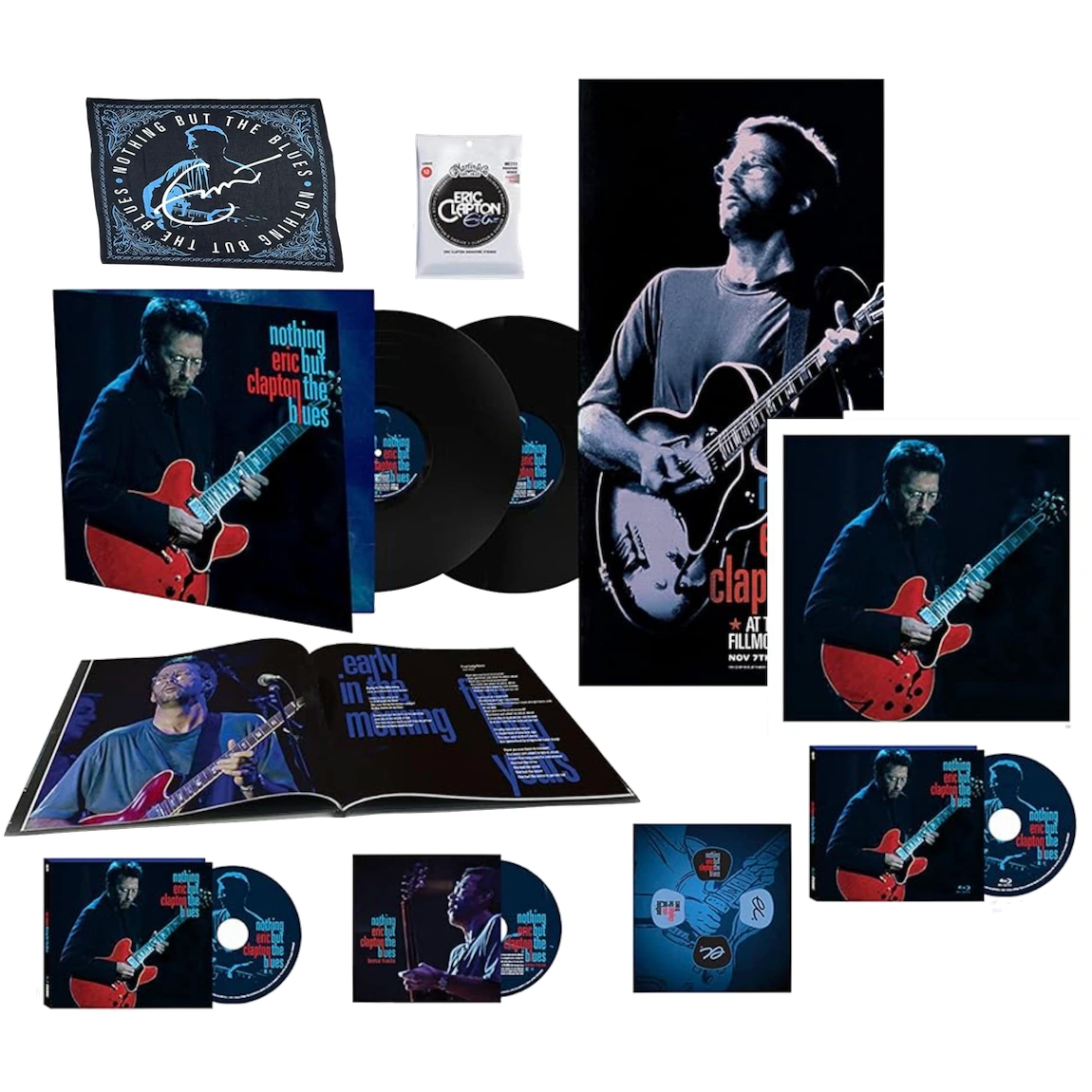 Eric Clapton’s lifelong passion for the blues burns brightly inNothing But The Blues. The soundtrack featuresmore than an hourof previously unreleased live performances recorded in 1994 during the legendary guitarist’s tour supportingFrom The Cradle, his GrammyÒ-winning, multi-platinum blues album.The film – which was broadcasted once in the U.S. on PBS in 1995 and nominated for an Emmy®Award – has been upgraded to 4K for its long-awaited official release. Written and produced by Scooter Weintraub and executive produced by Martin Scorsese, the documentary includes an in-depth interview with Clapton conducted by Scorsese. -The Super Deluxe Edition comes with the documentary on Blu-ray, the soundtrack on both 2-LP vinyl and CD, a bonus CD with four extra tracks “Driftin’,” County Jail Blues,” “Kid Man Blues,” and “It’s Too Bad,” and an exclusive hardcover book with memorabilia, including a numbered lithograph,12x24 poster, Clapton guitar string set, custom guitar picks, and an exclusive bandana.
